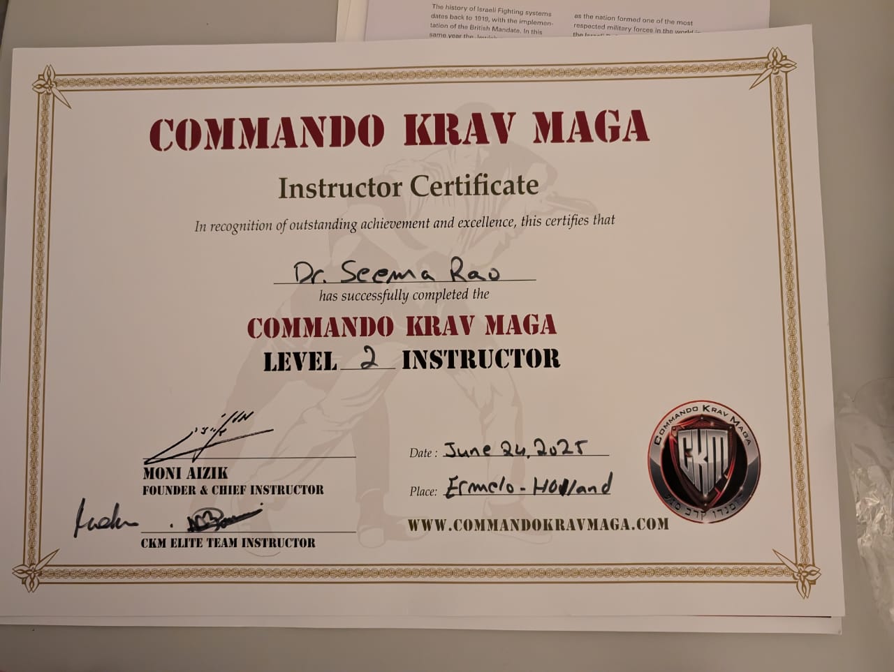 Dr. Seema trained in Commando Krav Maga, a lethal Israeli combat system, and earned the rank of Instructor under the guidance of Grand Master Moni Aizik, a former Israeli Special Forces Commando.